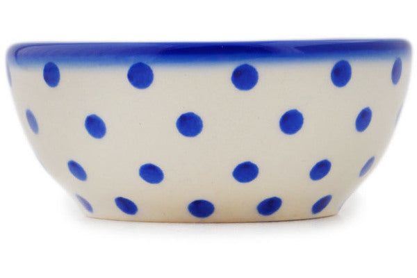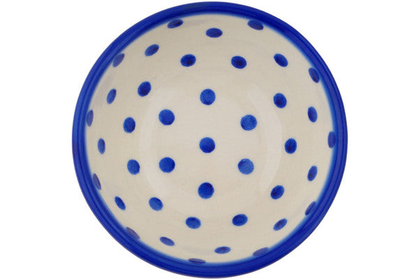This Polish Pottery Bowl is handmade and handpainted by the Ceramika Bona factory in Boleslawiec, Poland. Manufacturer item number H9818Q. It is 1¾" high and measures 4" by 4". The capacity of this Bowl is 4.94 oz (brimful) and it weighs 0.6 lbs. It is part of the Blue Polka Dot Collection.
