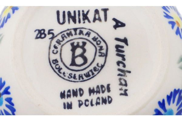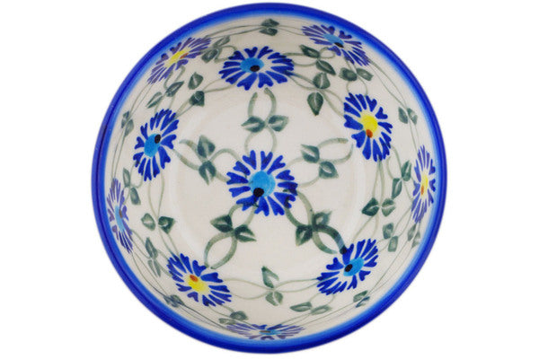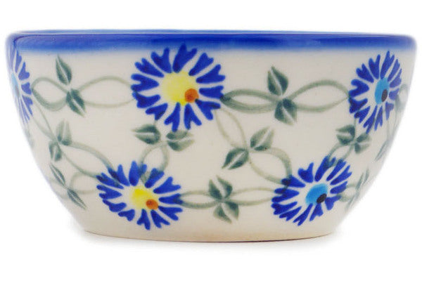 This Polish Pottery Bowl is handmade and handpainted by the Ceramika Bona factory in Boleslawiec, Poland. Manufacturer item number H2199R. It is 2" high and measures 4¼" by 4¼". The capacity of this Bowl is 7.91 oz (brimful) and it weighs 0.4 lbs. It is part of the Blue Thistle Beauty Collection.