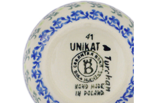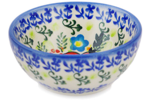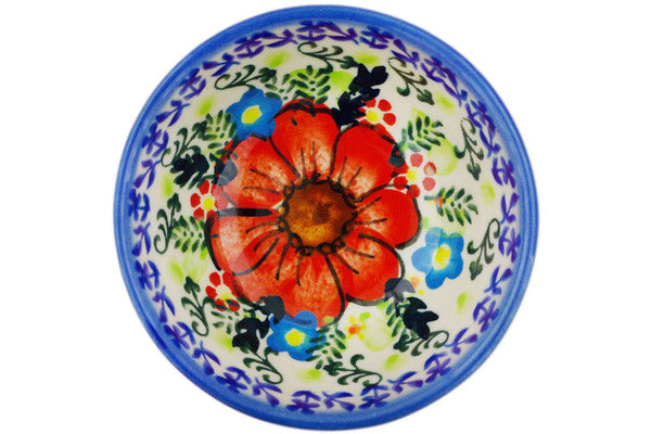 This Polish Pottery Bowl is handmade and handpainted by the Ceramika Bona factory in Boleslawiec, Poland. Manufacturer item number H0634F. It is 1¾" high and measures 4" by 4". The capacity of this Bowl is 4.94 oz (brimful) and it weighs 0.6 lbs. It is part of the Bold Red Poppies Collection.
