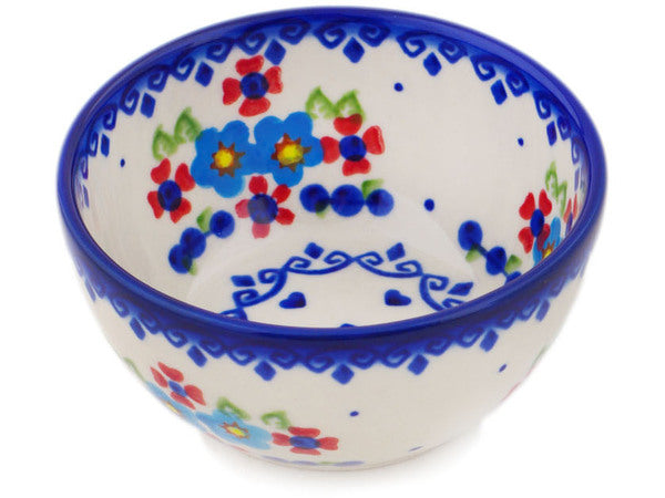 This Polish Pottery Bowl is handmade and handpainted by the Ceramika Bona factory in Boleslawiec, Poland. Manufacturer item number H0306Q. It is 2" high and measures 4¼" by 4¼". The capacity of this Bowl is 7.91 oz (brimful) and it weighs 0.4 lbs. It is part of the Hearts And Flowers Collection.
