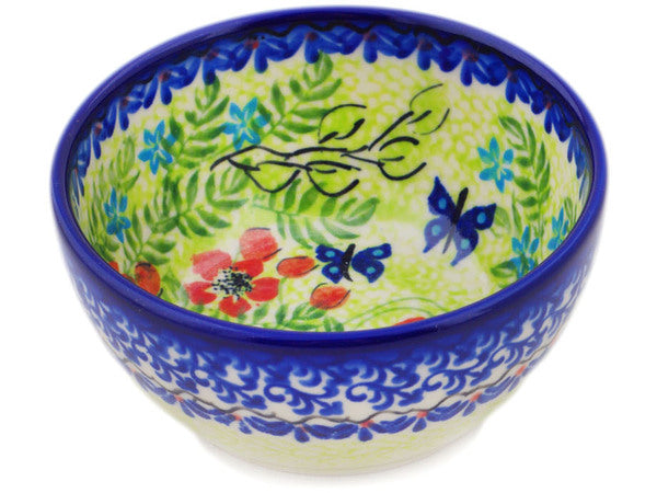 This Polish Pottery Bowl is handmade and handpainted by the Ceramika Bona factory in Boleslawiec, Poland. Manufacturer item number H8717Q. It is 2" high and measures 4¼" by 4". The capacity of this Bowl is 7.30 oz (brimful) and it weighs 0.4 lbs. It is part of the Metamorphosis Collection.