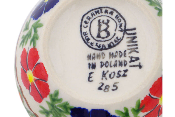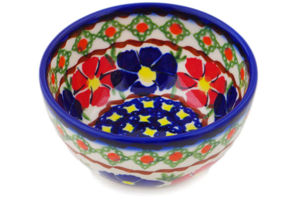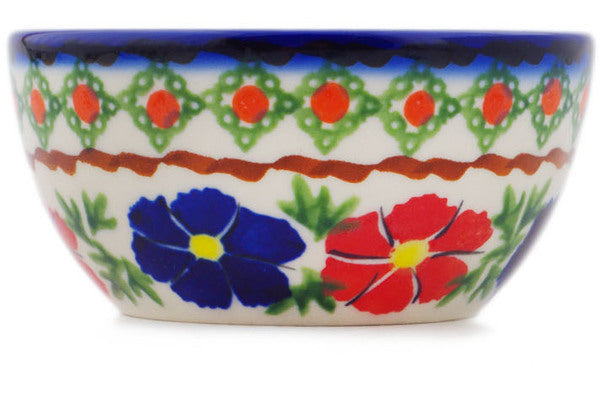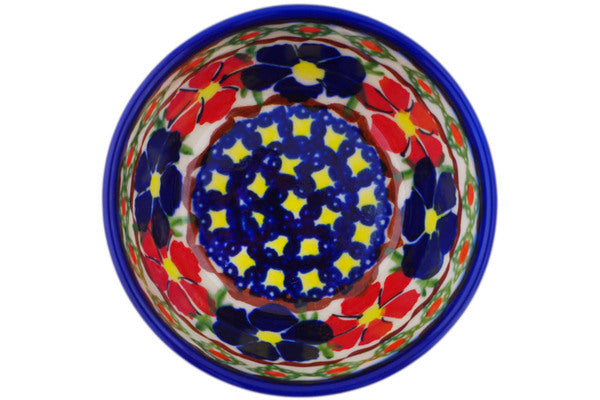 This Polish Pottery Bowl is handmade and handpainted by the Ceramika Bona factory in Boleslawiec, Poland. Manufacturer item number H1716Q. It is 2" high and measures 4¼" by 4¼". The capacity of this Bowl is 7.91 oz (brimful) and it weighs 0.4 lbs. It is part of the Paradise Poppy Collection.