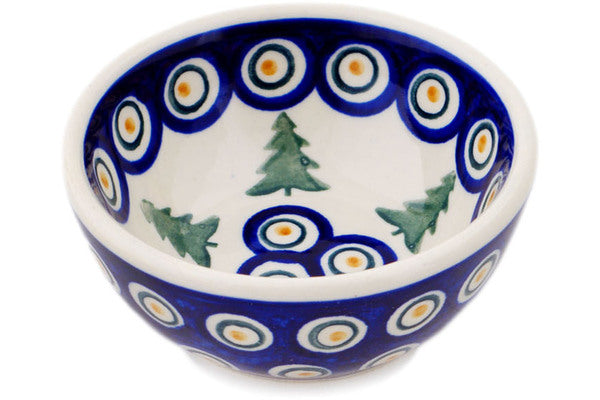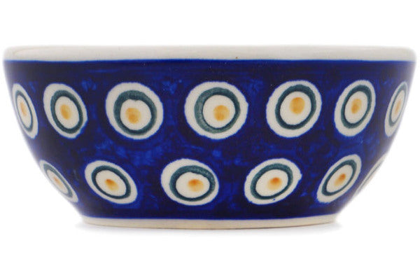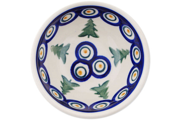 This Polish Pottery Bowl is handmade and handpainted by the Ceramika Bona factory in Boleslawiec, Poland. Manufacturer item number H8790E. It is 1¾" high and measures 4" by 4". The capacity of this Bowl is 4.94 oz (brimful) and it weighs 0.6 lbs. It is part of the Peacock Pines Collection.