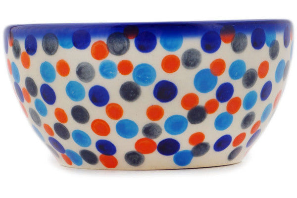 This Polish Pottery Bowl is handmade and handpainted by the Ceramika Bona factory in Boleslawiec, Poland. Manufacturer item number H1946R. It is 2" high and measures 4¼" by 4". The capacity of this Bowl is 7.30 oz (brimful) and it weighs 0.4 lbs. It is part of the Polka Dot Frenzy Collection.