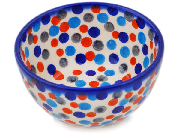 This Polish Pottery Bowl is handmade and handpainted by the Ceramika Bona factory in Boleslawiec, Poland. Manufacturer item number H1945R. It is 2" high and measures 4¼" by 4¼". The capacity of this Bowl is 7.91 oz (brimful) and it weighs 0.4 lbs. It is part of the Polka Dot Frenzy Collection.