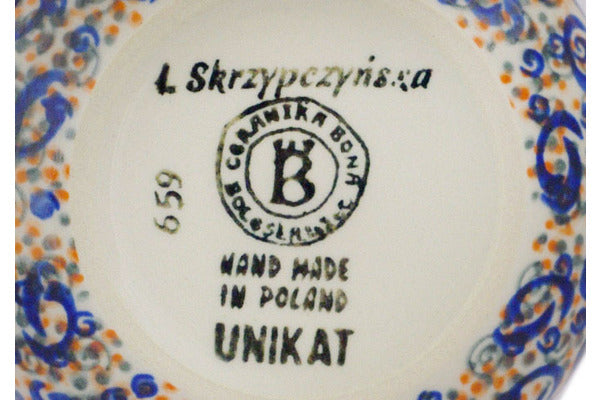 This is a Polish pottery Unikat (Signature) Bowl, which means that it has been hand painted with both sponges and brushes and it is signed by the artist who painted it. Unikat pieces are the most intricate works of art. Larger Unikat items take hours of very careful work to finish.