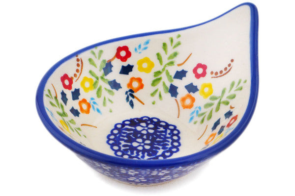 This Polish Pottery Bowl is handmade and handpainted by the Manufaktura factory in Boleslawiec, Poland. Manufacturer item number H8537P. It is 2¼" high and measures 4" by 3¼". The capacity of this Bowl is 2.10 oz (brimful) and it weighs 0.2 lbs. It is part of the Rainbow Delight Collection.