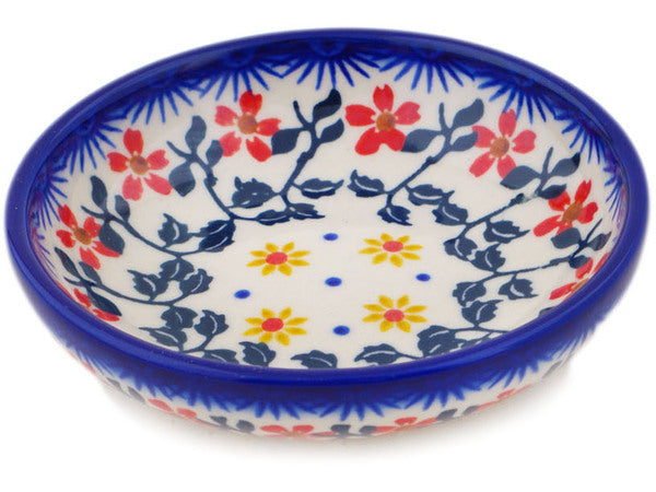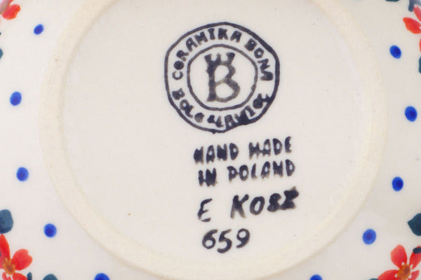 This Polish Pottery Bowl is handmade and handpainted by the Ceramika Bona factory in Boleslawiec, Poland. Manufacturer item number H4429Q. It is 1" high and measures 4½" by 4½". The capacity of this Bowl is 3.11 oz (brimful) and it weighs 0.4 lbs. It is part of the Red Sunflower Collection.