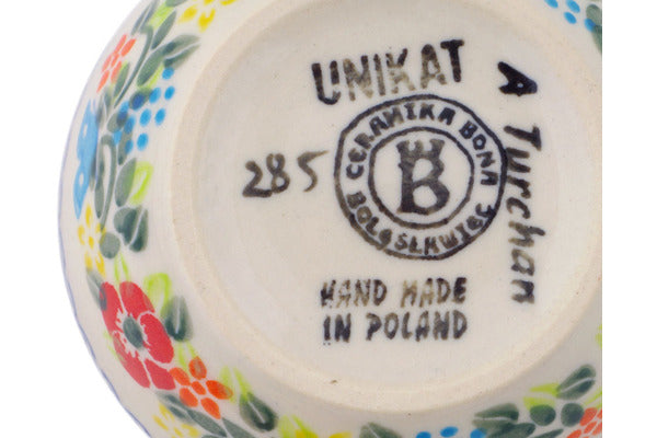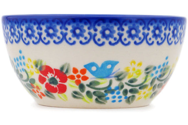 This Polish Pottery Bowl is handmade and handpainted by the Ceramika Bona factory in Boleslawiec, Poland. Manufacturer item number H0238Q. It is 2" high and measures 4¼" by 4¼". The capacity of this Bowl is 7.91 oz (brimful) and it weighs 0.4 lbs. It is part of the Ring Of Meadow Flowers Collection.