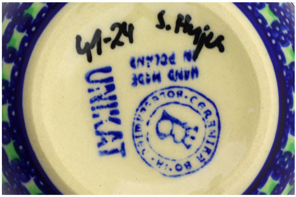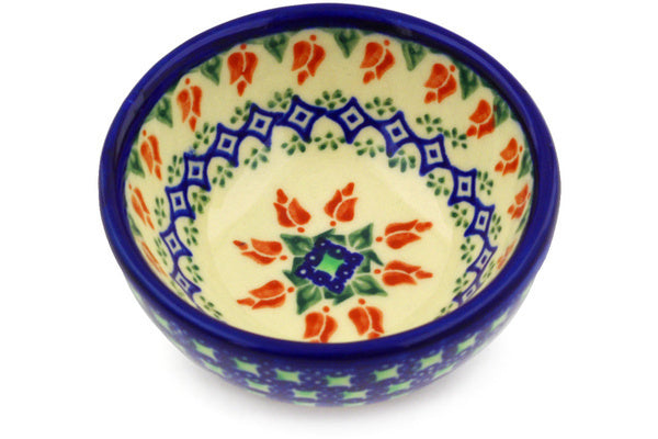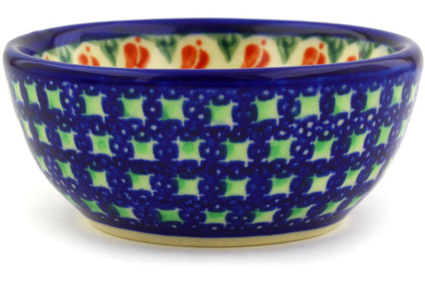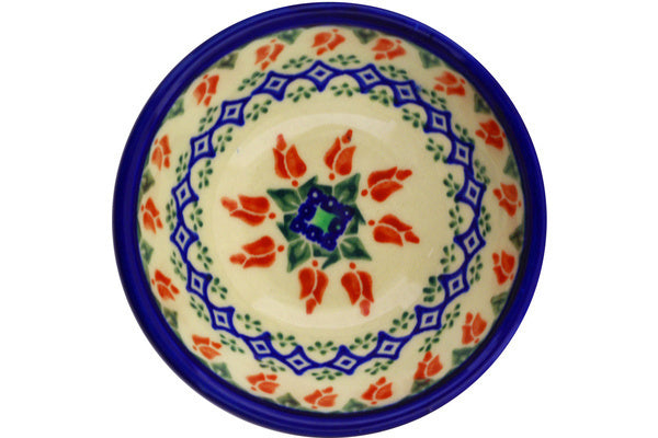 This Polish Pottery Bowl is handmade and handpainted by the Ceramika Bona factory in Boleslawiec, Poland. Manufacturer item number H9197F. It is 1¾" high and measures 4" by 4". The capacity of this Bowl is 4.94 oz (brimful) and it weighs 0.6 lbs. It is part of the Tulips And Diamonds Collection.