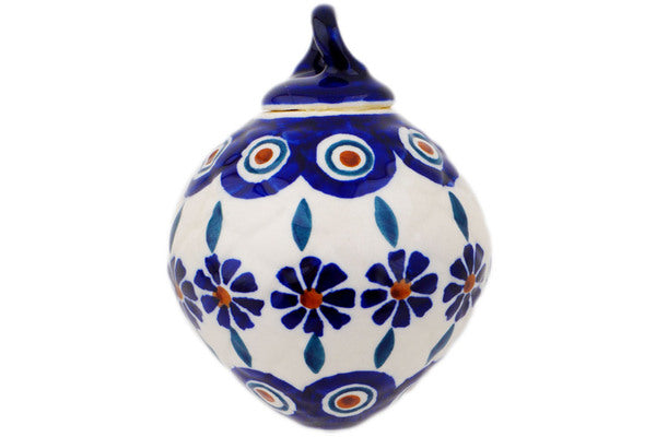 This Polish Pottery Christmas Ball Ornament is handmade and handpainted by the Manufaktura factory in Boleslawiec, Poland. Manufacturer item number H8527Q. It is 3¾" high and measures 3" by 3". The weight of this Christmas Ball Ornament is 0.3 lbs. It is part of the Peacock Collection.