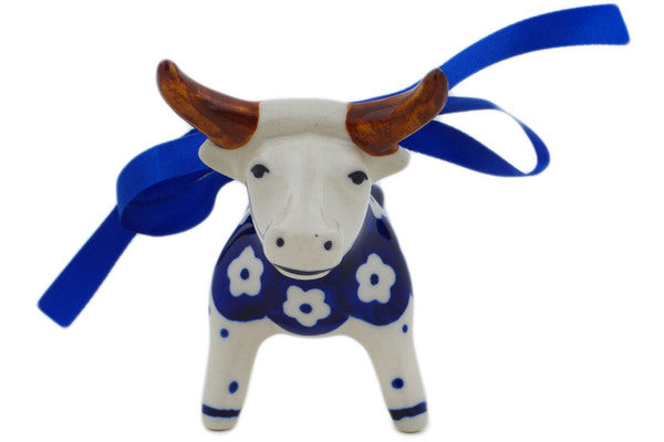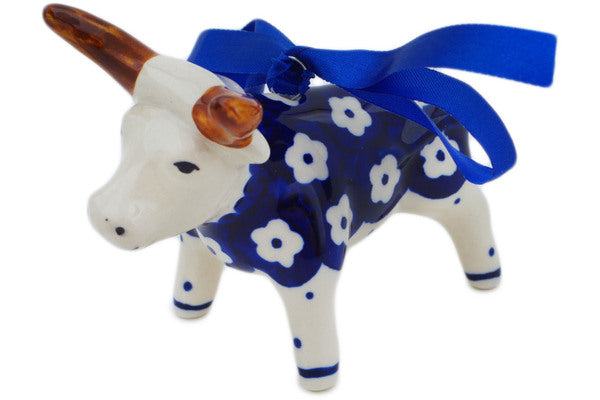 This Polish Pottery Cow Figurine is handmade and handpainted by the Manufaktura factory in Boleslawiec, Poland. Manufacturer item number H5326O. It is 3¼" high and measures 3¾" by 2¼". The weight of this Cow Figurine is 0.2 lbs. It is part of the Simple Daisy Collection.