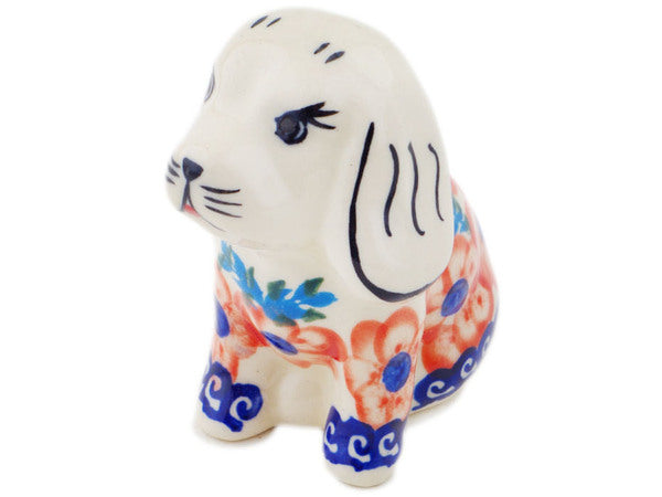 This Polish Pottery Dog Figurine is handmade and handpainted by the Ceramika Bona factory in Boleslawiec, Poland. Manufacturer item number H7086Q. It is 3¾" high and measures 3¼" by 2¼". The weight of this Dog Figurine is 0.4 lbs. It is part of the Flower Star Collection.