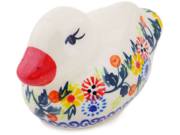 This Polish Pottery Duck Figurine is handmade and handpainted by the Ceramika Bona factory in Boleslawiec, Poland. Manufacturer item number H1972R. It is 2½" high and measures 4" by 2¼". The weight of this Duck Figurine is 0.3 lbs. It is part of the Pastel Spring Wreath Collection.