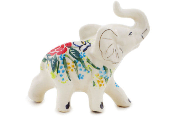This Polish Pottery Elephant Figurine is handmade and handpainted by the Ceramika Bona factory in Boleslawiec, Poland. Manufacturer item number H0491P. It is 3½" high and measures 3½" by 1½". The weight of this Elephant Figurine is 0.2 lbs. It is part of the Fresh Happiness Collection.