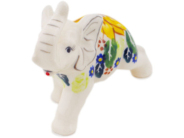 This Polish Pottery Elephant Figurine is handmade and handpainted by the Ceramika Bona factory in Boleslawiec, Poland. Manufacturer item number H3509R. It is 3½" high and measures 3½" by 1½". The weight of this Elephant Figurine is 0.2 lbs. It is part of the Sunflower Yellow Petal Bliss Collection.
