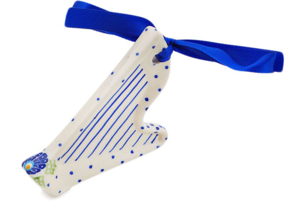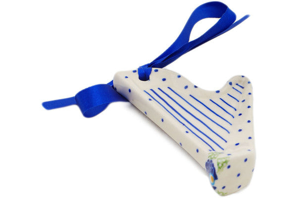 This Polish Pottery Harp Ornament is handmade and handpainted by the Manufaktura factory in Boleslawiec, Poland. Manufacturer item number H2510P. It is 3½" high and measures 2¼" by ¾". The weight of this Harp Ornament is 0.1 lbs. It is part of the Tail Feathers Collection.