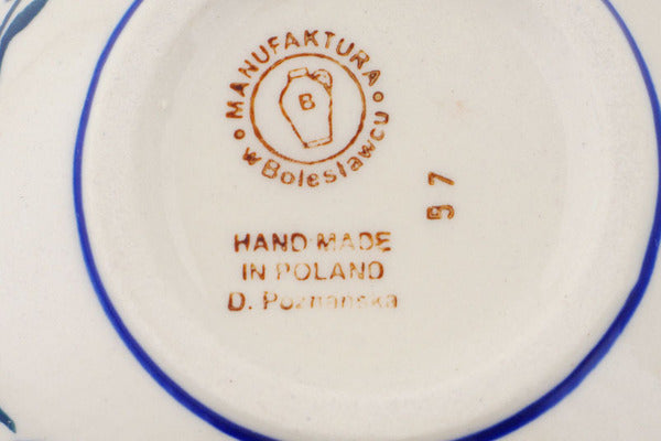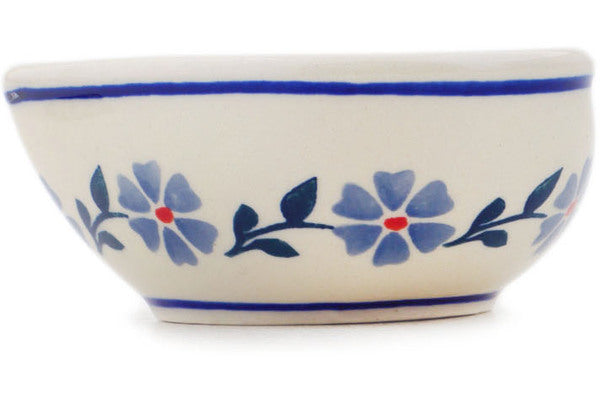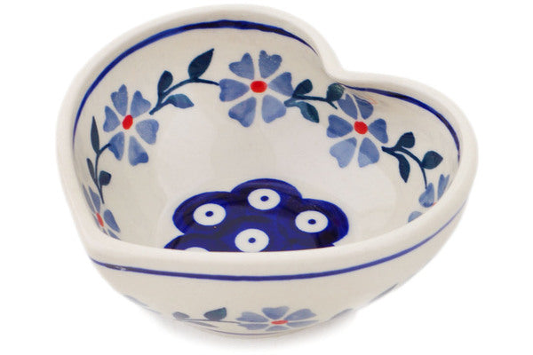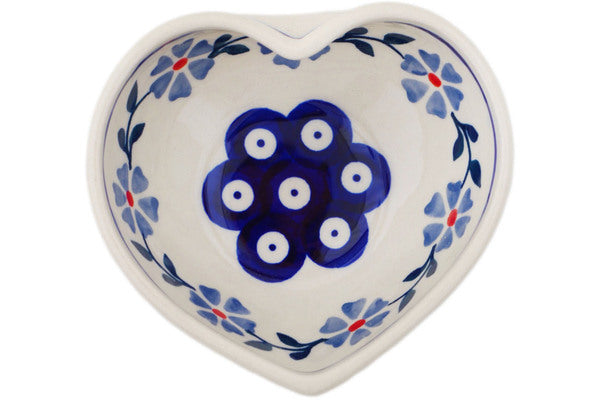 This Polish Pottery Heart Shaped Bowl is handmade and handpainted by the Manufaktura factory in Boleslawiec, Poland. Manufacturer item number H7259O. It is 1¾" high and measures 4½" by 4¼". The capacity of this Heart Shaped Bowl is 6.36 oz (brimful) and it weighs 0.4 lbs. It is part of the Peacock Forget-Me-Not Collection.