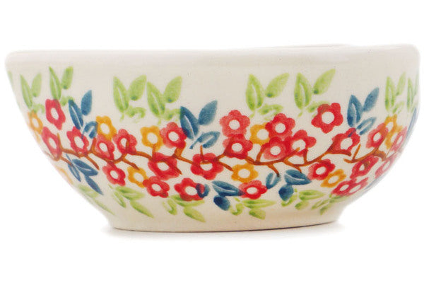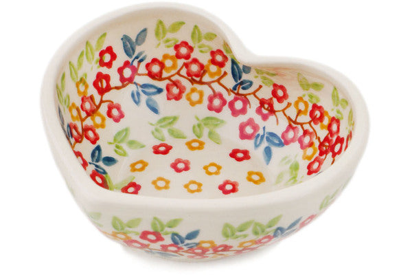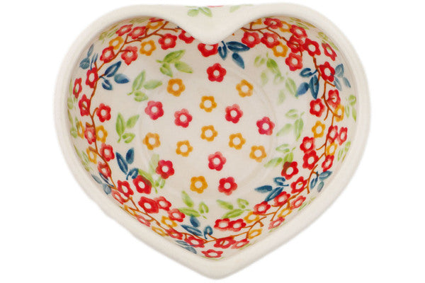 This Polish Pottery Heart Shaped Bowl is handmade and handpainted by the Manufaktura factory in Boleslawiec, Poland. Manufacturer item number H8295P. It is 1¾" high and measures 4½" by 4¼". The capacity of this Heart Shaped Bowl is 6.36 oz (brimful) and it weighs 0.4 lbs. It is part of the Tropical Bloomscape Collection.