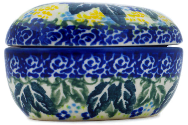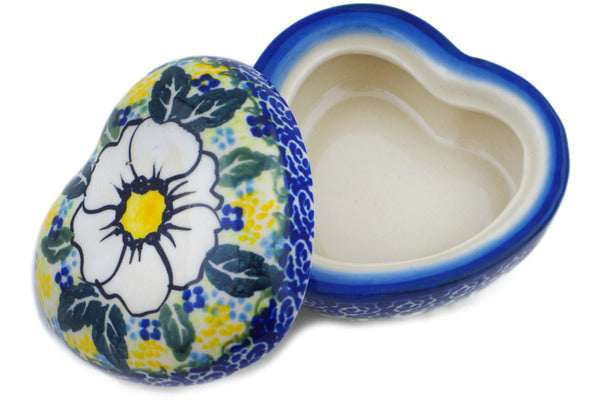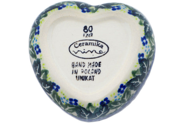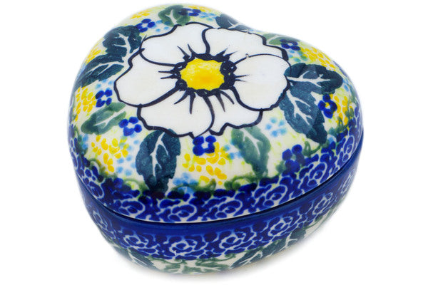 This Polish Pottery Heart Shaped Jar is handmade and handpainted by the Ceramika Nina factory in Boleslawiec, Poland. Manufacturer item number H1974P. It is 2¼" high and measures 3¾" by 3¾". The capacity of this Heart Shaped Jar is 5.07 oz (brimful) and it weighs 0.6 lbs. It is part of the Floral Fantasy Collection.