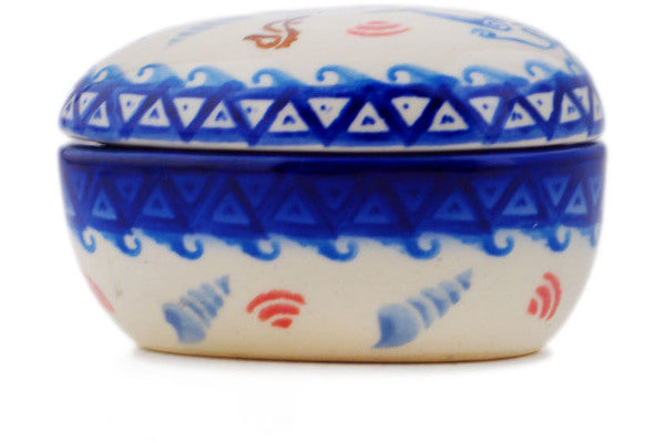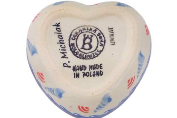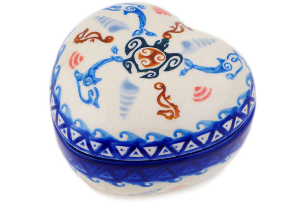 This Polish Pottery Heart Shaped Jar is handmade and handpainted by the Ceramika Bona factory in Boleslawiec, Poland. Manufacturer item number H1882P. It is 2¼" high and measures 3¾" by 3¾". The capacity of this Heart Shaped Jar is 5.07 oz (brimful) and it weighs 0.6 lbs. It is part of the Hawaiian Sea Turtle - Honu Collection.