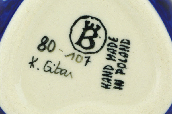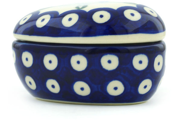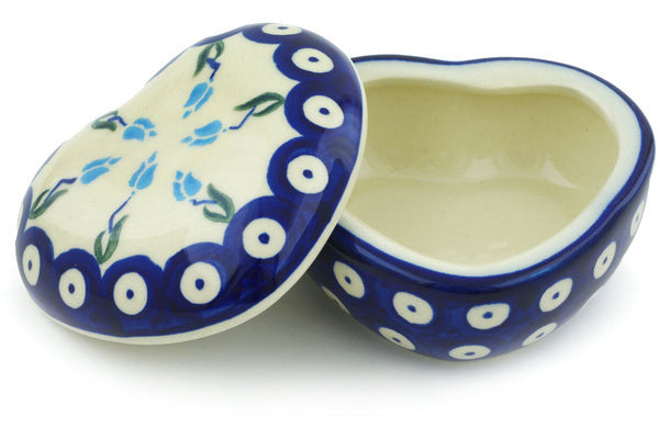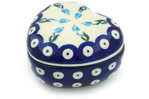This Polish Pottery Heart Shaped Jar is handmade and handpainted by the Ceramika Bona factory in Boleslawiec, Poland. Manufacturer item number H4066H. It is 2¼" high and measures 3¾" by 3¾". The capacity of this Heart Shaped Jar is 5.07 oz (brimful) and it weighs 0.6 lbs. It is part of the Peacock Tulip Garden Collection.