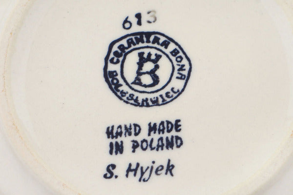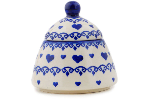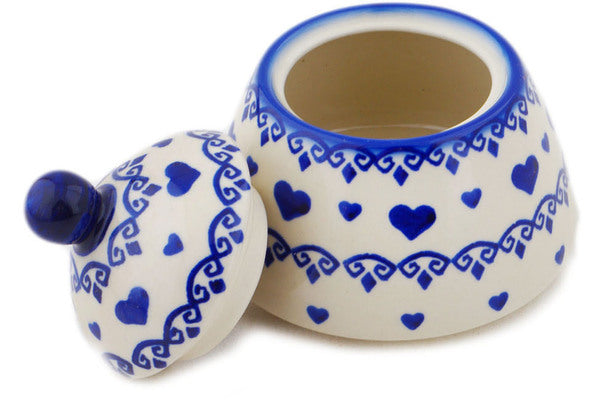 This Polish Pottery Jar with Lid is handmade and handpainted by the Ceramika Bona factory in Boleslawiec, Poland. Manufacturer item number H9630O. It is 4¼" high and measures 4¼" by 4¼". The capacity of this Jar with Lid is 10.08 oz (brimful) and it weighs 0.6 lbs. It is part of the Blue Valentine Hearts Collection.
