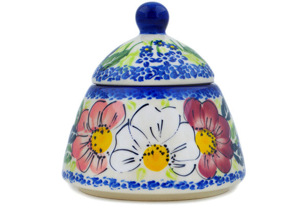 This Polish Pottery Jar with Lid is handmade and handpainted by the Ceramika Nina factory in Boleslawiec, Poland. Manufacturer item number H2803P. It is 4¼" high and measures 4¼" by 4¼". The capacity of this Jar with Lid is 10.08 oz (brimful) and it weighs 0.6 lbs. It is part of the Maroon Blossoms Collection.
