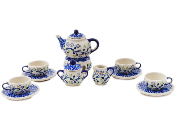 This Polish Pottery Mini Tea Set is handmade and handpainted by the Manufaktura factory in Boleslawiec, Poland. Manufacturer item number H8252P. It is 2½" high and measures 3¾" by 2½". The weight of this Mini Tea Set is 1.2 lbs. It is part of the Branches Of Delicacy Collection.