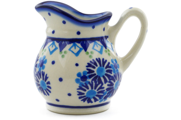 This Polish Pottery Creamer is handmade and handpainted by the Ceramika Bona factory in Boleslawiec, Poland. Manufacturer item number H3999J. It is 3" high and measures 3½" by 2¾". The capacity of this Creamer is 4.19 oz (brimful) and it weighs 0.3 lbs. It is part of the Aster Patches Collection.