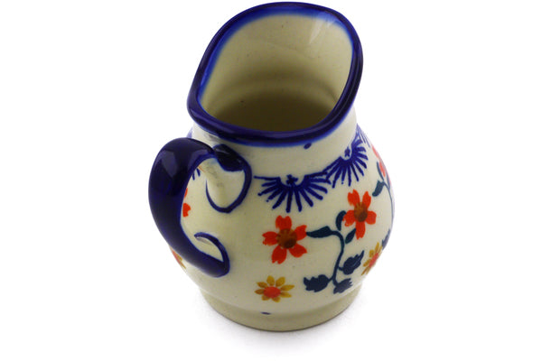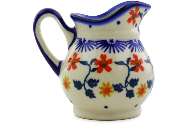 This Polish Pottery Creamer is handmade and handpainted by the Ceramika Bona factory in Boleslawiec, Poland. Manufacturer item number H9238I. It is 3" high and measures 3½" by 2¾". The capacity of this Creamer is 4.19 oz (brimful) and it weighs 0.3 lbs. It is part of the Red Sunflower Collection.