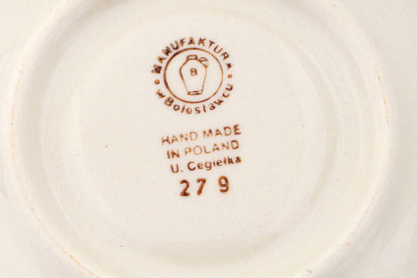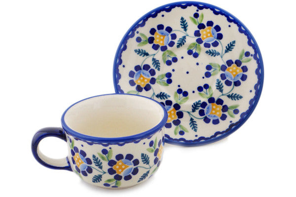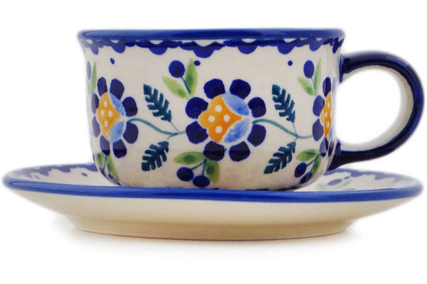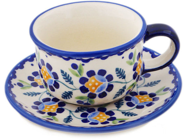 This Polish Pottery Cup with Saucer is handmade and handpainted by the Manufaktura factory in Boleslawiec, Poland. Manufacturer item number H8166P. It is 2¼" high and measures 4¾" by 4¾". The capacity of this Cup with Saucer is 3.85 oz (brimful) and it weighs 0.7 lbs. It is part of the Orange And Blue Flower Collection.