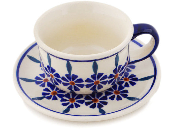 This Polish Pottery Cup with Saucer is handmade and handpainted by the Manufaktura factory in Boleslawiec, Poland. Manufacturer item number H8554P. It is 2¼" high and measures 4¾" by 4¾". The capacity of this Cup with Saucer is 3.85 oz (brimful) and it weighs 0.7 lbs. It is part of the Peacock Collection.