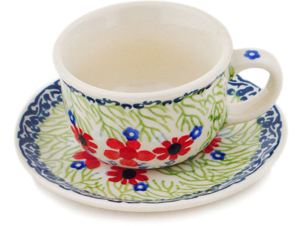 This Polish Pottery Cup with Saucer is handmade and handpainted by the Manufaktura factory in Boleslawiec, Poland. Manufacturer item number H8565P. It is 2¼" high and measures 4¾" by 4¾". The capacity of this Cup with Saucer is 3.85 oz (brimful) and it weighs 0.7 lbs. It is part of the Red Blossom Collection.