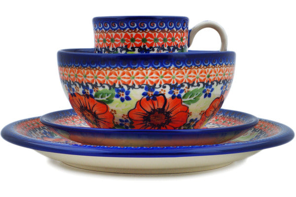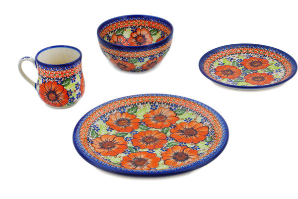 This Polish Pottery Place Setting is handmade and handpainted by the Ceramika Nina factory in Boleslawiec, Poland. Manufacturer item number H4908P. It is 3¾" high and measures 10¼" by 10¼". The capacity of this Place Setting is 24.01 oz (brimful) and it weighs 4.4 lbs. It is part of the Orange Zinnia Collection.