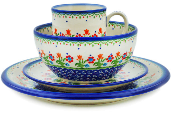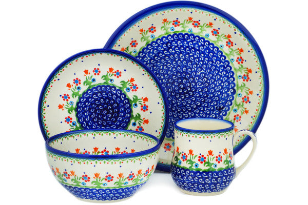 This Polish Pottery Place Setting is handmade and handpainted by the Ceramika Bona factory in Boleslawiec, Poland. Manufacturer item number H9301N. It is 3¾" high and measures 10¼" by 10¼". The capacity of this Place Setting is 24.01 oz (brimful) and it weighs 4.4 lbs. It is part of the Spring Flowers Collection.
