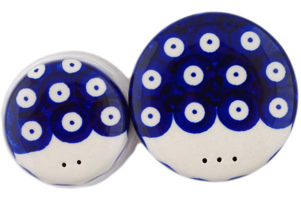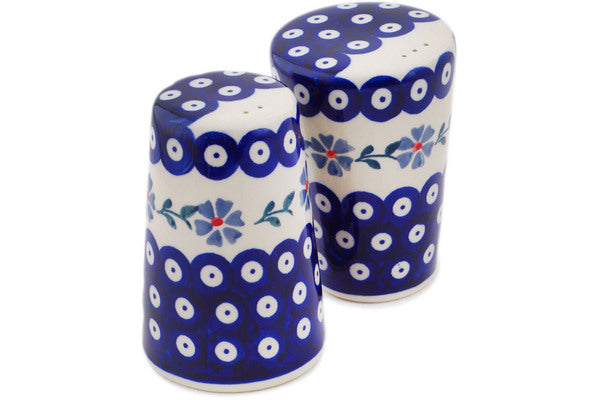 This Polish Pottery Salt and Pepper Set is handmade and handpainted by the Manufaktura factory in Boleslawiec, Poland. Manufacturer item number H7427O. It is 4½" high and measures 2¾" by 2¾". The weight of this Salt and Pepper Set is 1.1 lbs. It is part of the Peacock Forget-Me-Not Collection.