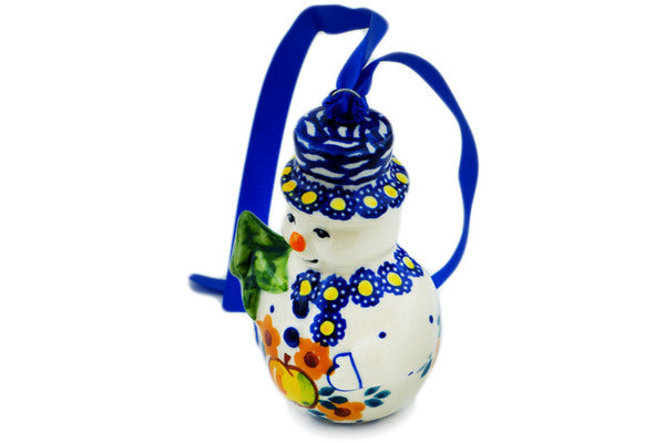 This is a Polish pottery Unikat (Signature) Snowman Ornament, which means that it has been hand painted with both sponges and brushes and it is signed by the artist who painted it. Unikat pieces are the most intricate works of art. Larger Unikat items take hours of very careful work to finish.