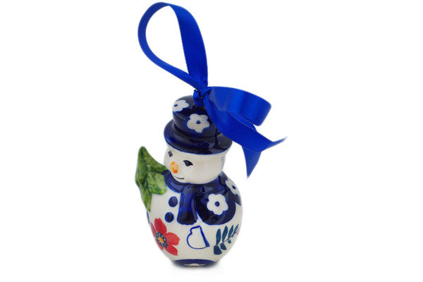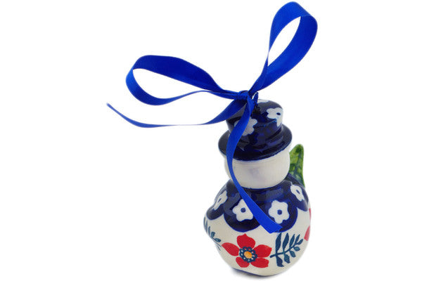 This Polish Pottery Snowman Ornament is handmade and handpainted by the Manufaktura factory in Boleslawiec, Poland. Manufacturer item number H4311O. It is 1¾" high and measures 3½" by 2¼". The weight of this Snowman Ornament is 0.2 lbs. It is part of the Poppies And Ferns Collection.