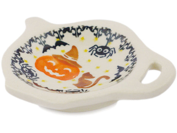 This Polish Pottery Tea Bag or Lemon Plate is handmade and handpainted by the Ceramika Bona factory in Boleslawiec, Poland. Manufacturer item number H5724R. It is ¾" high and measures 4½" by 3¾". The weight of this Tea Bag or Lemon Plate is 0.3 lbs. It is part of the Halloween Spooky Pumpkin Collection.