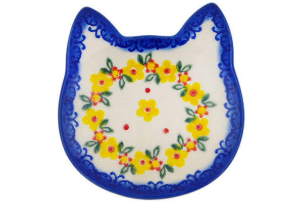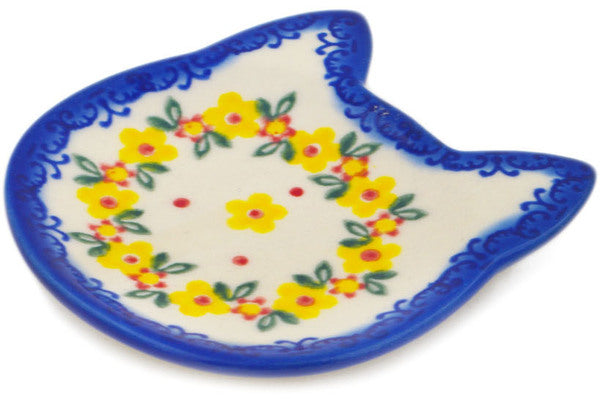 This Polish Pottery Tea Bag or Lemon Plate is handmade and handpainted by the Vena factory in Boleslawiec, Poland. Manufacturer item number H0335R. It is ½" high and measures 3¾" by 3½". The weight of this Tea Bag or Lemon Plate is 0.2 lbs. It is part of the Sweet Golden Flowers Collection.
