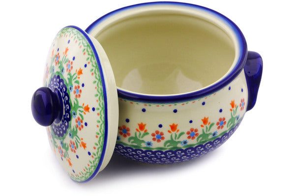 This Polish Pottery Tureen is handmade and handpainted by the Ceramika Bona factory in Boleslawiec, Poland. Manufacturer item number H9575I. It is 5¼" high and measures 7¼" by 6½". The capacity of this Tureen is 40.58 oz (brimful) and it weighs 2.4 lbs. It is part of the Spring Flowers Collection.