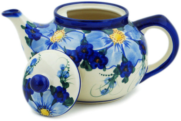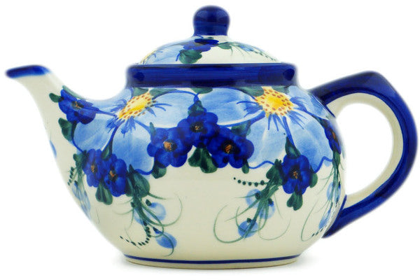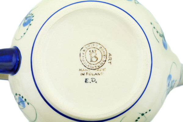 This Polish Pottery Tea or Coffee Pot is handmade and handpainted by the Two People factory in Boleslawiec, Poland. Manufacturer item number H3376N. It is 6¼" high and measures 9¾" by 6¼". The capacity of this Tea or Coffee Pot is 42.54 oz (brimful) and it weighs 2.2 lbs. It is part of the Himalayan Blue Poppy Collection.