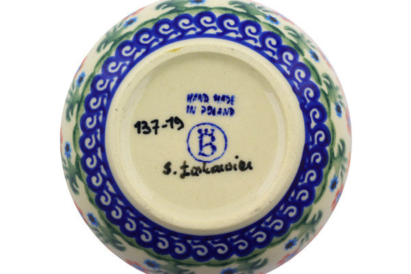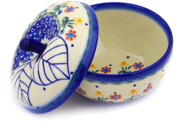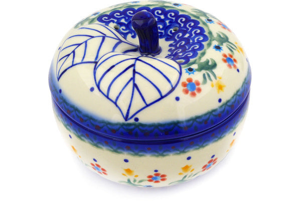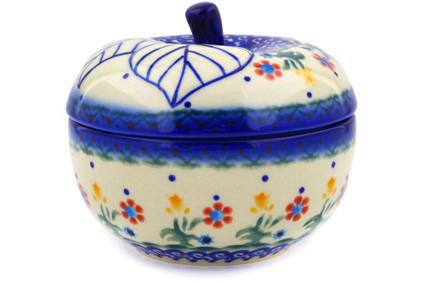This Polish Pottery Apple Shaped Jar is handmade and handpainted by the Ceramika Bona factory in Boleslawiec, Poland. Manufacturer item number H3749E. It is 4½" high and measures 5¼" by 5¼". The capacity of this Apple Shaped Jar is 15.22 oz (brimful) and it weighs 1.2 lbs. It is part of the Spring Flowers Collection.