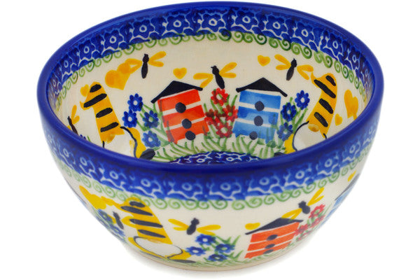 This Polish Pottery Bowl is handmade and handpainted by the Ceramika Nina factory in Boleslawiec, Poland. Manufacturer item number H1582P. It is 2¼" high and measures 5¼" by 5¼". The capacity of this Bowl is 13.53 oz (brimful) and it weighs 0.8 lbs. It is part of the Beekeeper Gnome Collection.