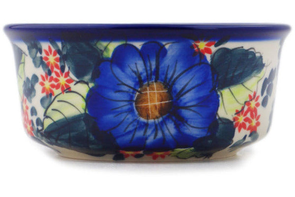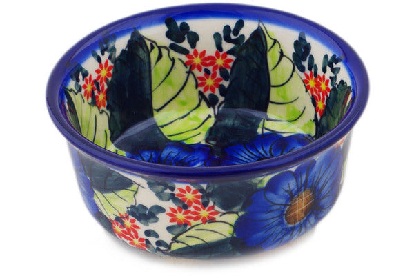 This Polish Pottery Bowl is handmade and handpainted by the Ceramika Bona factory in Boleslawiec, Poland. Manufacturer item number H4065Q. It is 2¼" high and measures 5¼" by 5¼". The capacity of this Bowl is 15.49 oz (brimful) and it weighs 0.8 lbs. It is part of the Blue Bouquet Collection.