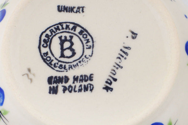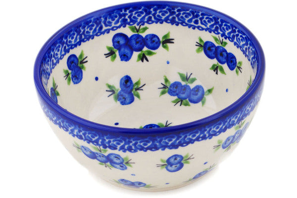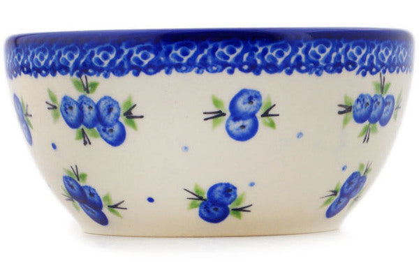 This Polish Pottery Bowl is handmade and handpainted by the Ceramika Bona factory in Boleslawiec, Poland. Manufacturer item number H0999P. It is 2¼" high and measures 5¼" by 5¼". The capacity of this Bowl is 13.53 oz (brimful) and it weighs 0.8 lbs. It is part of the Blueberry Dreams Collection.