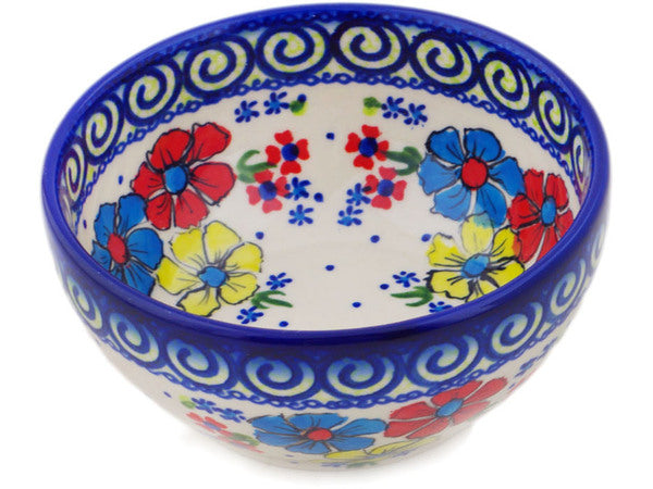 This Polish Pottery Bowl is handmade and handpainted by the Ceramika Bona factory in Boleslawiec, Poland. Manufacturer item number H2176R. It is 2½" high and measures 5¼" by 5¼". The capacity of this Bowl is 16.23 oz (brimful) and it weighs 0.7 lbs. It is part of the Country Three Collection.