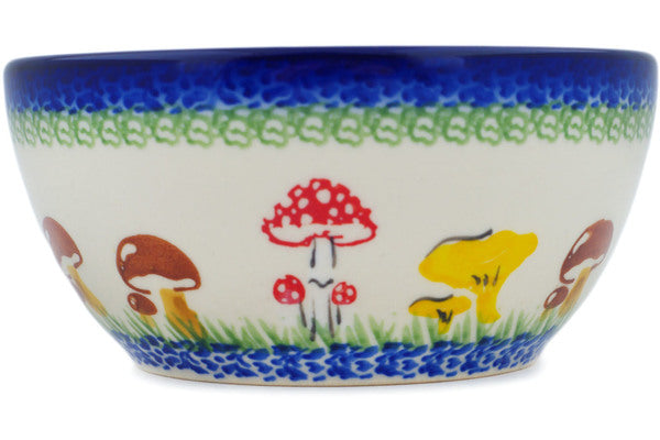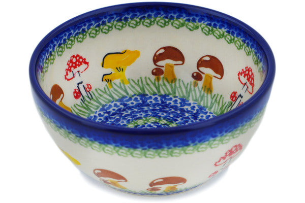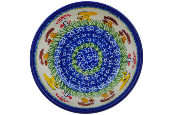 This Polish Pottery Bowl is handmade and handpainted by the Ceramika Nina factory in Boleslawiec, Poland. Manufacturer item number H1555P. It is 2¼" high and measures 5¼" by 5¼". The capacity of this Bowl is 13.53 oz (brimful) and it weighs 0.8 lbs. It is part of the Wild Mushroom Picking Collection.