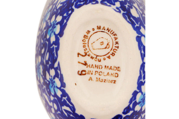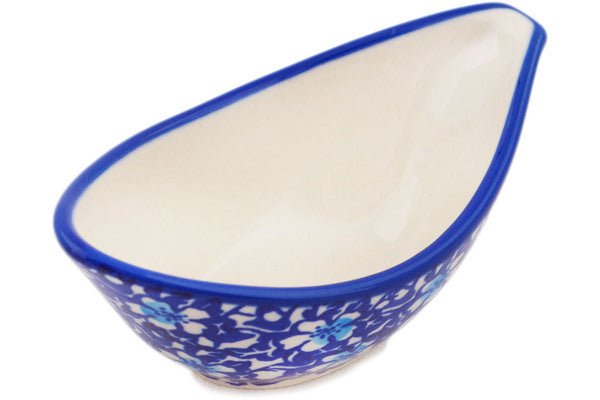 This Polish Pottery Bowl is handmade and handpainted by the Manufaktura factory in Boleslawiec, Poland. Manufacturer item number H7314P. It is 2" high and measures 4½" by 2¾". The capacity of this Bowl is 2.64 oz (brimful) and it weighs 0.3 lbs. It is part of the Flowers On The Lake Collection.